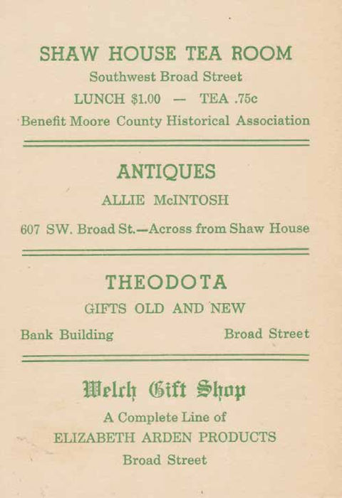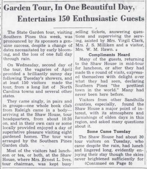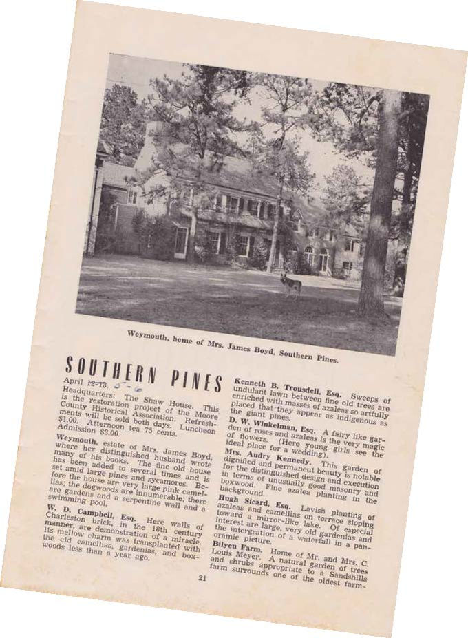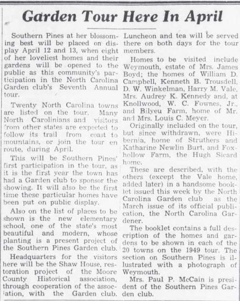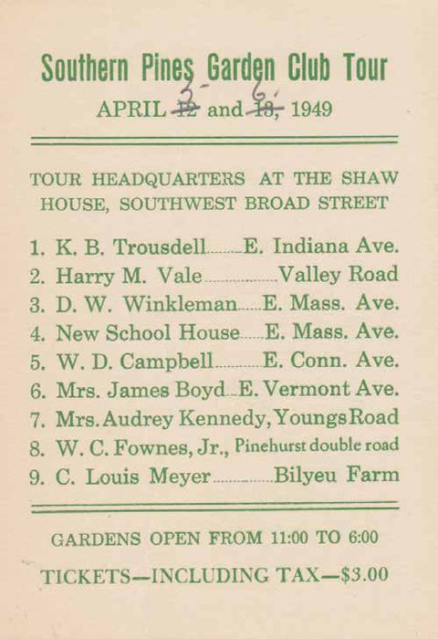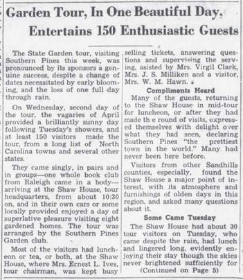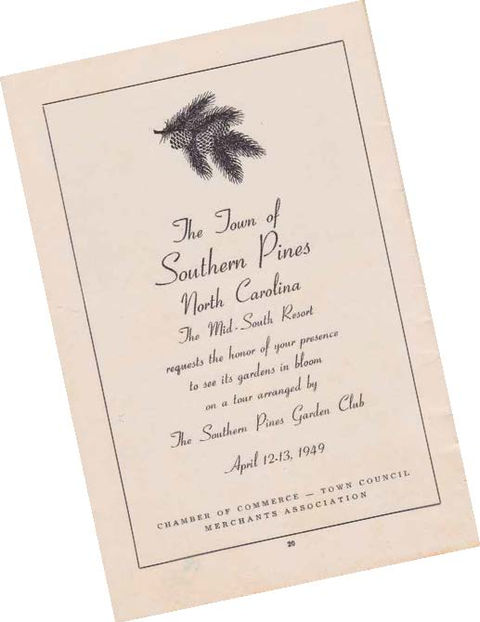 The Southern Pines Garden Club was founded in 1948 by Mrs. Elizabeth "Buffie" Ives and her friends with the purpose of giving horticultural support to the restoration of Shaw House, a historic landmark built in 1820. Twenty "knees in the dirt" gardeners, all active members of the Southern Pines community, were asked to join the organization. The club continued to focus on projects that directly enhanced the beauty of the town "wherever needed". An annual garden tour was established at the beginning to help finance the landscaping programs of the club, and included the homes and gardens of owners. With increased revenue from these popular tours, more ambitious plans were achieved. From the first, Alfred B. Yeomans, the distinguished local landscape architect, aided the club with free advice on native plant selection and design. At the newest schools, the town hall, along the railroad tracks and along major town right of ways, trees and flowering plants were installed by club members. This work continued for decades and today these mature trees and shrubs define our exceptional and well-known downtown landscape. When the Weymouth Center was founded in 1977, the Southern Pines Garden Club gave a $500.00 check to the Board specifically to help save the historic flowering cherry trees. In the towns of Southern Pines and Pinehurst, the club organized volunteers to improve the appearance of signs, rights of way, sidewalks and unsightly dumps. Member's voices were heard regularly at town meetings on issues concerning the preservation of trees, improvement of neighborhoods and quality of life. Today's Southern Pines Appearance Commission is the direct descendant of these early collaborative efforts. Presently the Club has 36 members dedicated to continuing the work of its founders. The yearly tour of homes and gardens in April provides funds for scholarships for horticulture students at Sandhills Community College as well as professional lectures and local perseveration and education projects. Among the most recent projects of the club is the replanting of missing dogwoods along major roadways in our area. These original dogwoods were dedicated as a Southern Pines World War II Memorial by Alfred Yeomans and planted by the town. The Southern Pines Garden Club continues this effort with new plantings that will mature as a fitting reminder to those fallen in war. The Southern Pines Garden Club continues to actively underwrite and support the remarkable cultural landscape that is the hallmark of Southern Pines. Written by Andrea Leech, SPGC member